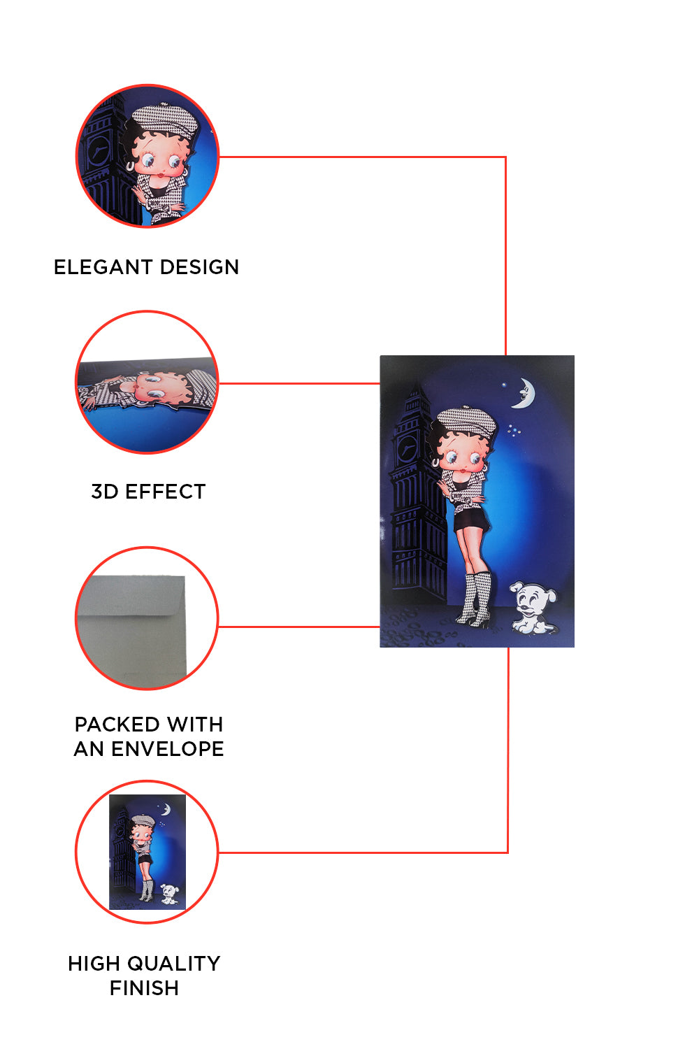 Betty Boop Decoupage Blank Greetings Card (3D) is an intricately designed 3D card and has a high-quality sequin finish on the card. This card will stand out among all other greetings cards and comes packed in a plastic cover with an envelope. Complimentary colour combination is used for soothing visual appeal.