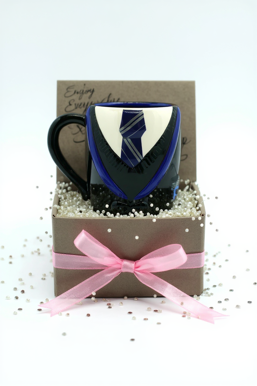 Crafted from durable ceramic with a glossy black and blue finish accented by black tie details, designed to resist chipping and ensure long-lasting use with a smooth, high-quality texture that feels wonderful in hand.