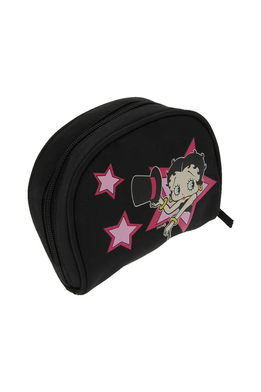 ➡The cosmetic case is black in color and showcases Betty in a Show Girl pose, wearing a black hat and dress, emerging from a pink star. There is also a pink star design beside her.