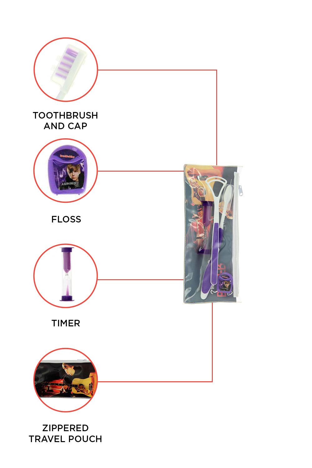 Brush Buddies Justin Bieber Travel Kit is officially licensed Justin Bieber merchandise that is designed in the USA. It looks great with a cute picture of Justin Bieber on it. The kit features a Justin Bieber adult toothbrush, five yards of Justin Bieber mint dental floss, a tongue cleaner a two-minute timer, and a toothbrush cap, pre-packaged in a convenient zippered travel pouch. These tools are important if you want to maintain your oral health while enjoying your travel or holiday. This travel-sized oral hygiene item will make maintaining oral health easier. The more compact your items are, the more likely you are to keep them handy and use them. They are very easy to put in a carry-on or a purse. The kit is white and purple in color. It’s easy to get caught up in the fun of a vacation, but you owe it to your overall health to maintain your oral care routine. Remember to brush twice per day for two minutes at a time, and floss once per day. Not suitable for children less than 3 years.
