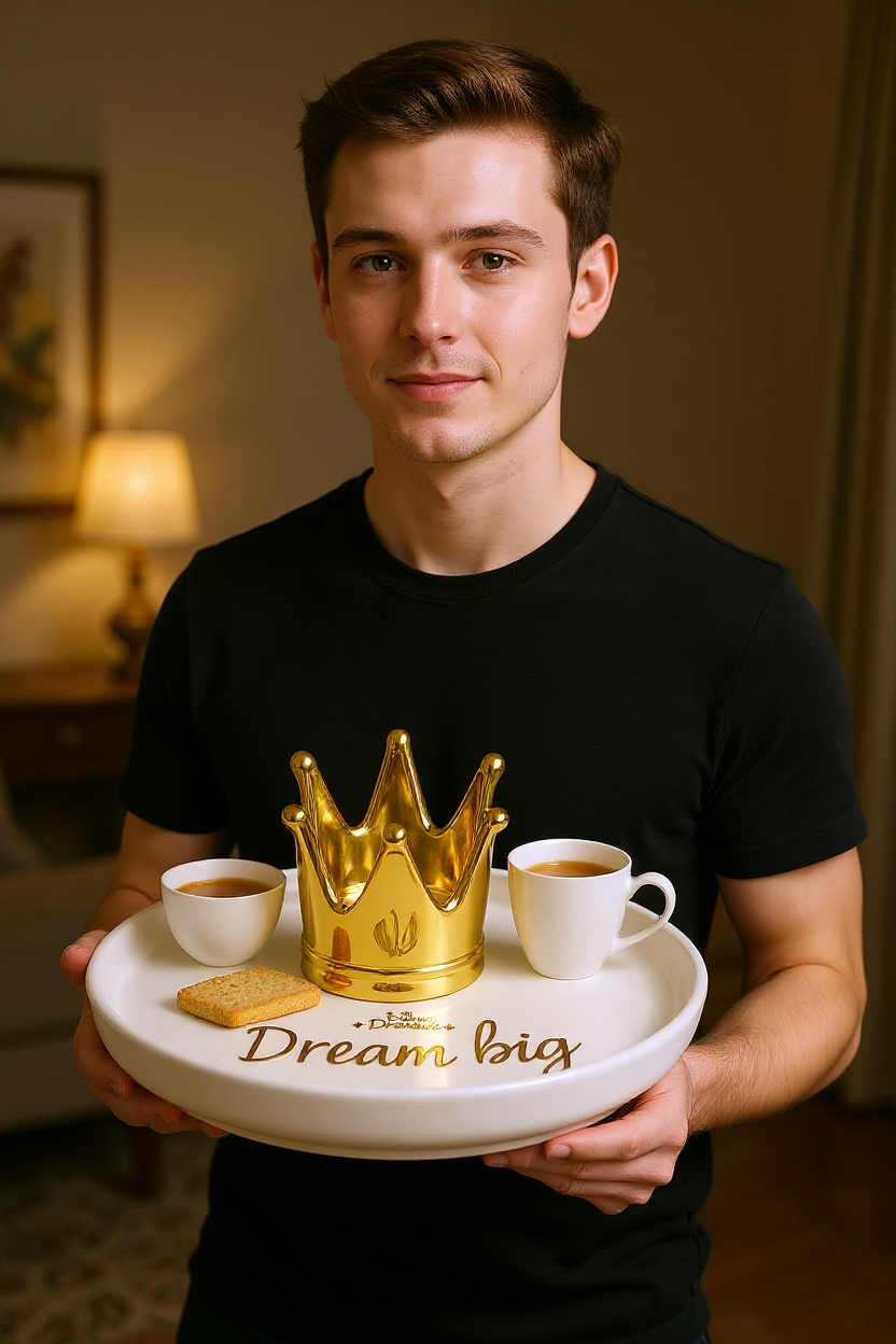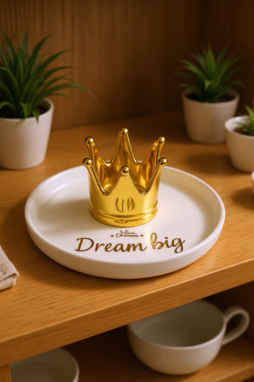 Showcases intricate crown and jewel motifs with a polished edge with a text “Dream Big” on the dish, adding a majestic, classic touch that brings royal splendor to life.