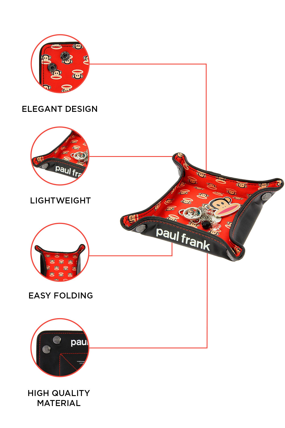 Paul Frank Julius Monkey Face Men’s Storage Tray It’s a lovely coin tray that has a Julius monkey face design all over the tray on the inside red soft and silky cloth lining. It has black PU leather outside with Paul Frank printed in white on the front. It has high-quality snap buttons in the four corners, making it easy to fold and unfold.