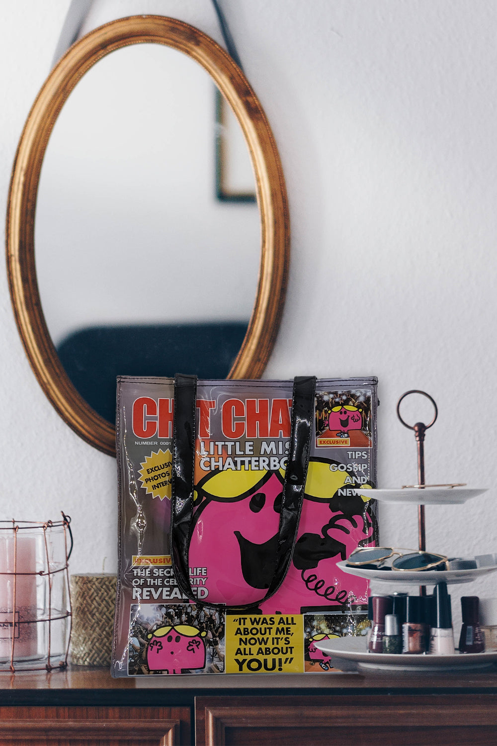 Little Miss Chatterbox Plastic Tote Shopper Bag is a lovely pink color bag with an image of Little Miss Sunshine in a magazine cover page design which says ‘Secret life of celebrities revealed’ and ‘It was all about me, now it’s all about you’ the backside of the bag has the same image as the front. A smart and trendy bag that will become your prized possession. The elegant appearance with a large capacity can be a lovely gift for your friend and family.
