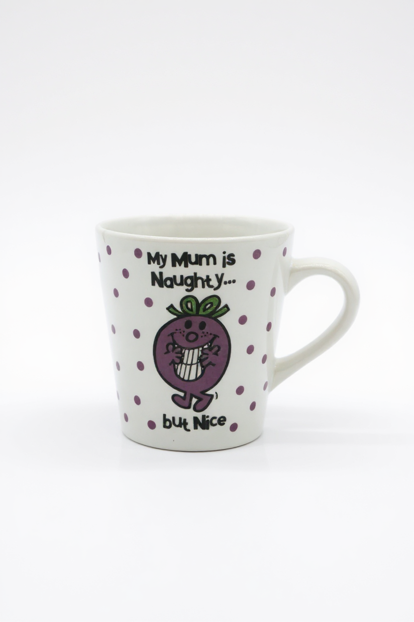Showcases Little Miss Naughty’s cheeky grin with a pattern of bold purple polka dots, accented by the "Little miss naughty" and “My Mum is naughty but nice” text in bold black lettering, adding a fun, classic touch that brings a sense of naughtiness and timeless appeal to life.