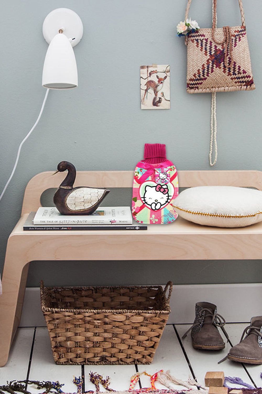 Hello Kitty Blossom Dream design Hot Water Bottle with Cover has 2 litres capacity. It’s a lovely hot water bottle in bright pink colour which has a Britain flag design in the background with kitty face in a heart design in the middle with a pink bow and blossom design all over. It has a stretchy pullover crew neck top with a pink ribbon on it. This hot water bottle can be used for heat therapy to relive pain and bring relief in the affected area. Fill the bottle up to 2/3rd of the bottle with hot water for usage.