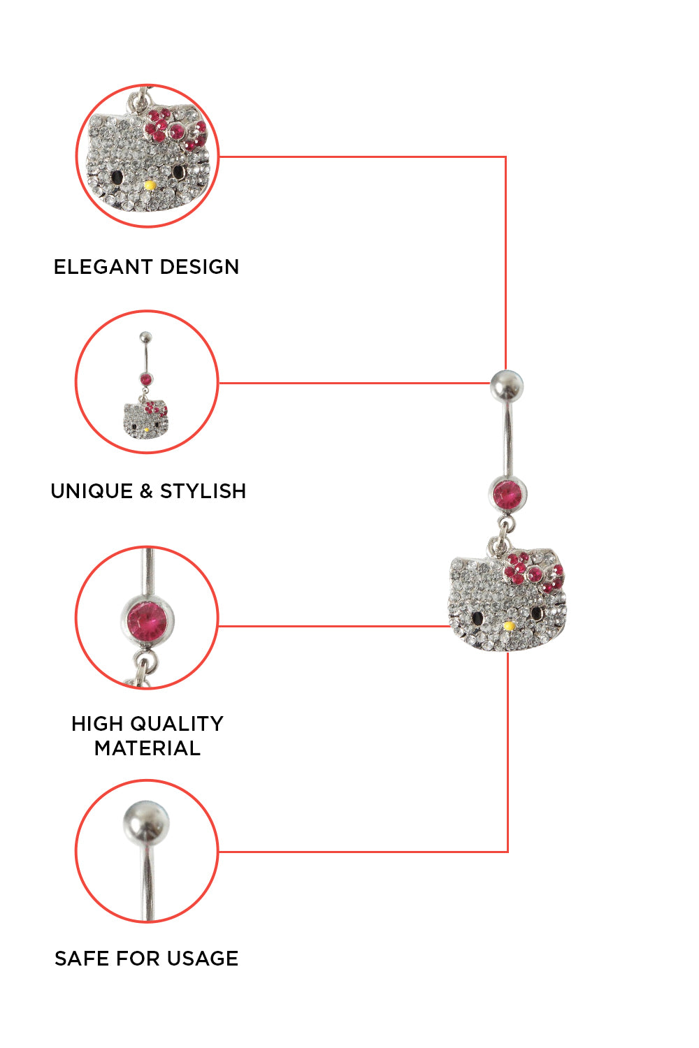 The Kitty Face belly bar has a round Austrian crystal on top and features a white enamel-coated white iconic Hello Kitty-shaped charm with a pink bow which makes it very attractive. This is body piercing jewellery thus made from high-quality surgical metal safe for usage. This belly bar can be ideal for a Kitty fan.