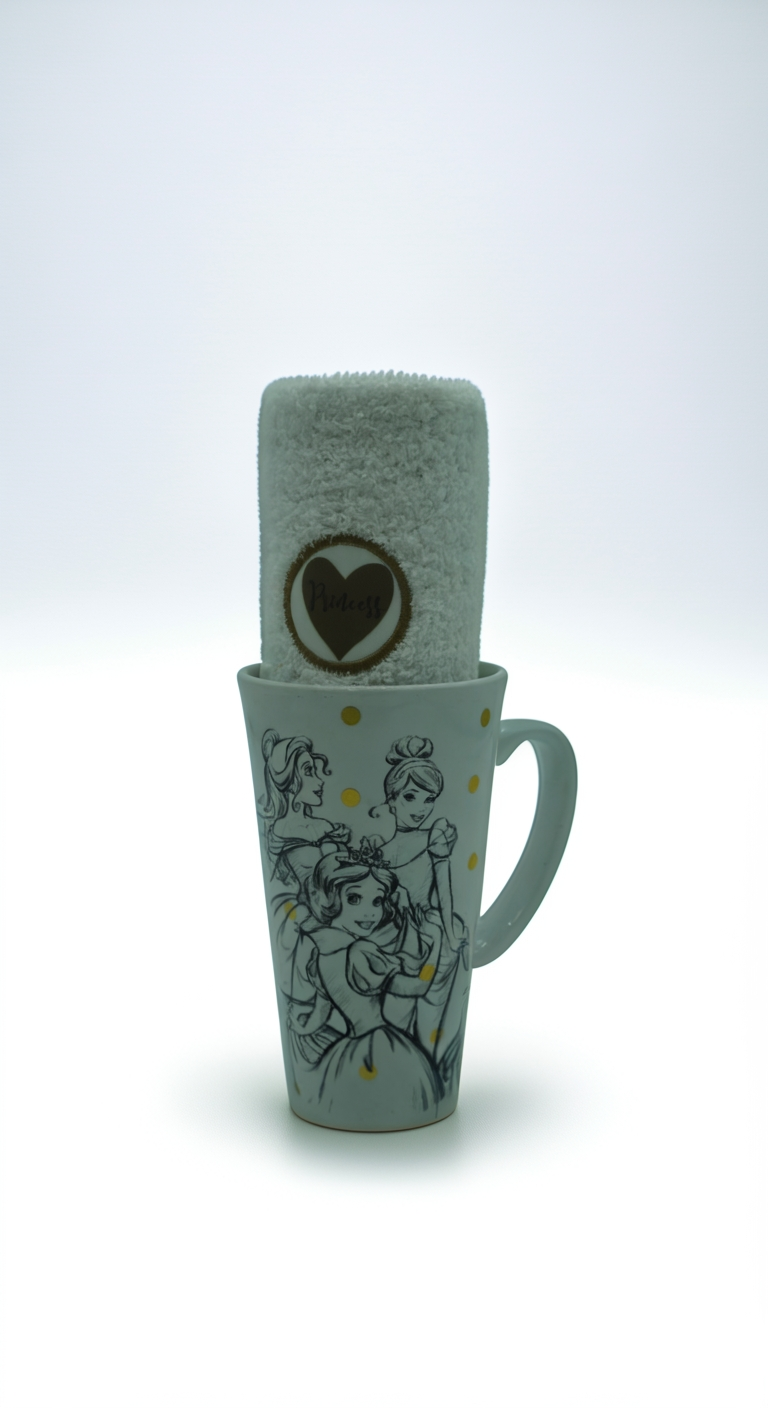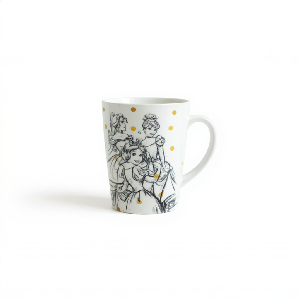 Official Licensed Product: The set features elegant ceramic mugs adorned with artistic sketch-style illustrations of classic princesses, accented by charming gold polka dots for a subtle sparkle. The coordinating fluffy socks include a cozy knit texture and a heart patch detail, creating a warm, inviting, and Instagram-worthy look.