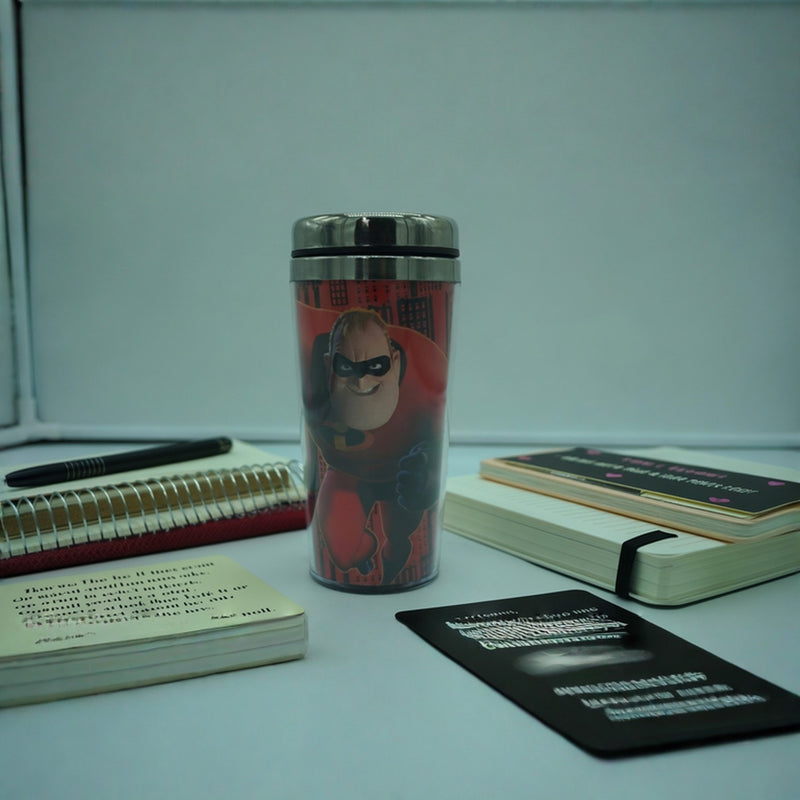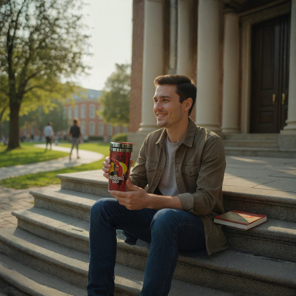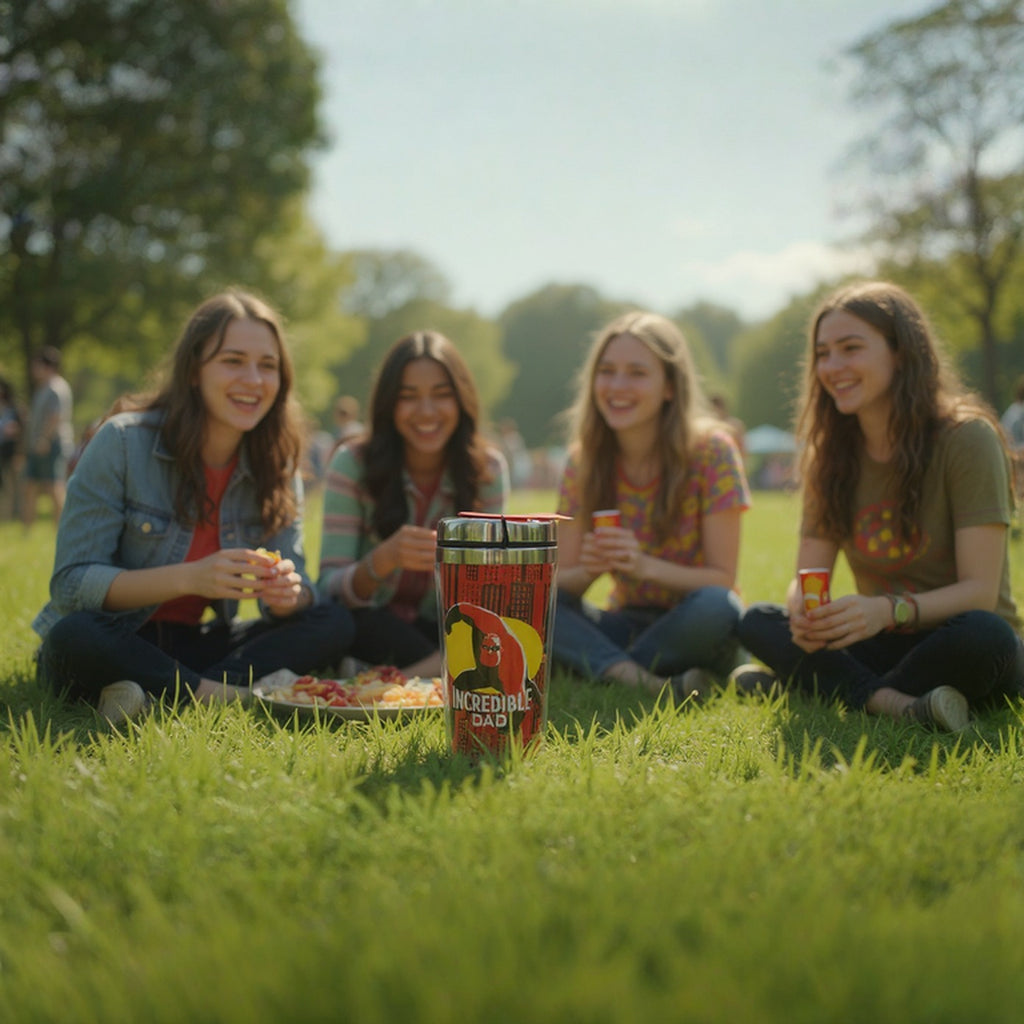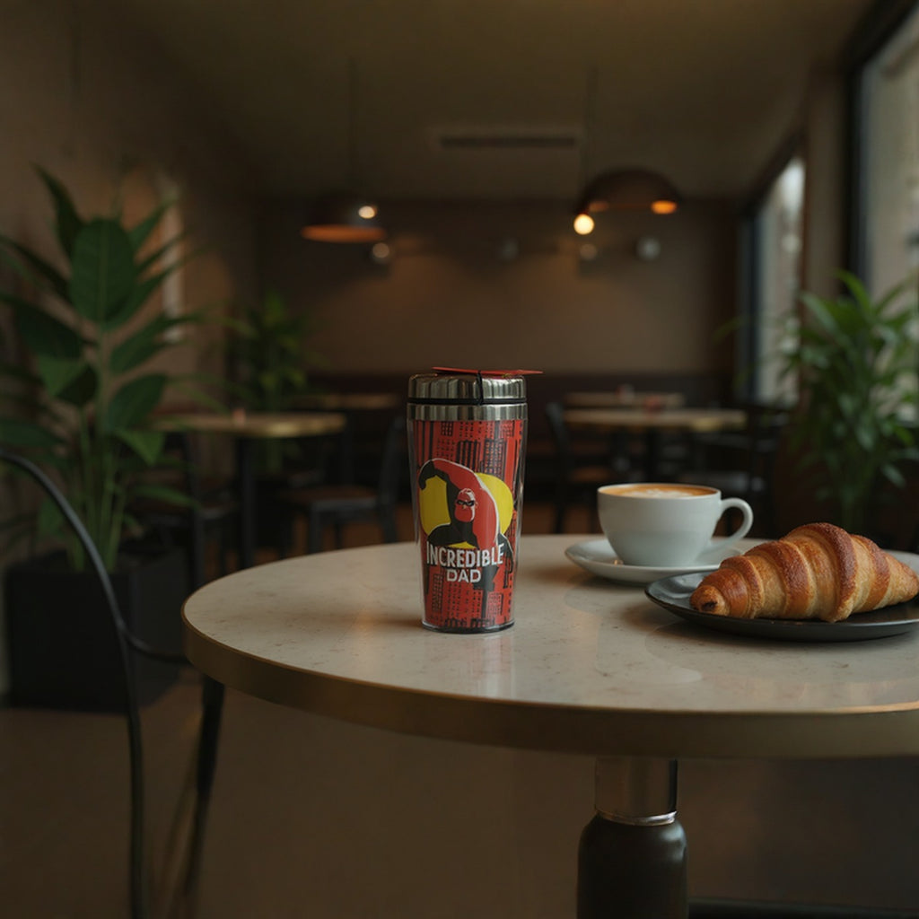 Heroic Design for Super Dads Everywhere: Featuring an animated superhero graphic with “Incredible Dad” text, this bold tumbler celebrates fatherhood in style, perfect for birthdays or Father’s Day gifts.