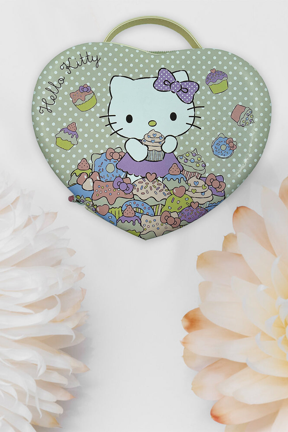 - A lovely beige colour polka dot Heart shape Jewellery box featuring Hello Kitty with all her favourite sweet treats all around her on top of the jewellery box.