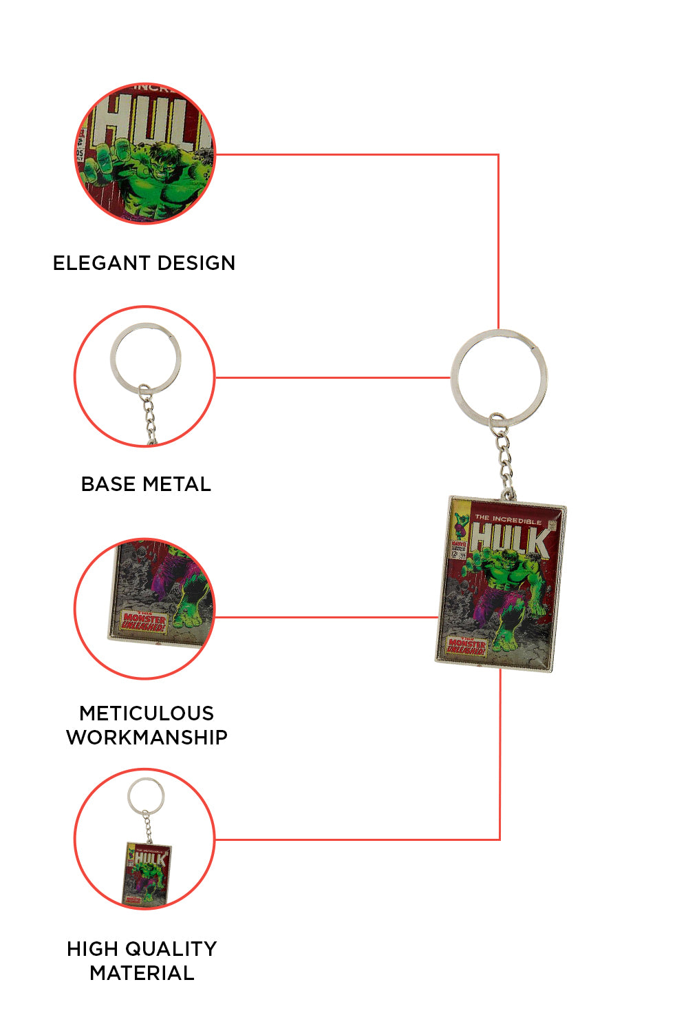 Hulk Keyring is a premium range key ring that comes with a high-quality superior finish. This is made from base metal featuring Hulk in a comic design background giving it an old comic cover page look. This key ring design is elegant with a touch of class. It shows your unique style and can become your own style statement. It can take the effects of daily wear and tear easily and is apt for regular use. This keying comes in hang tag packaging.