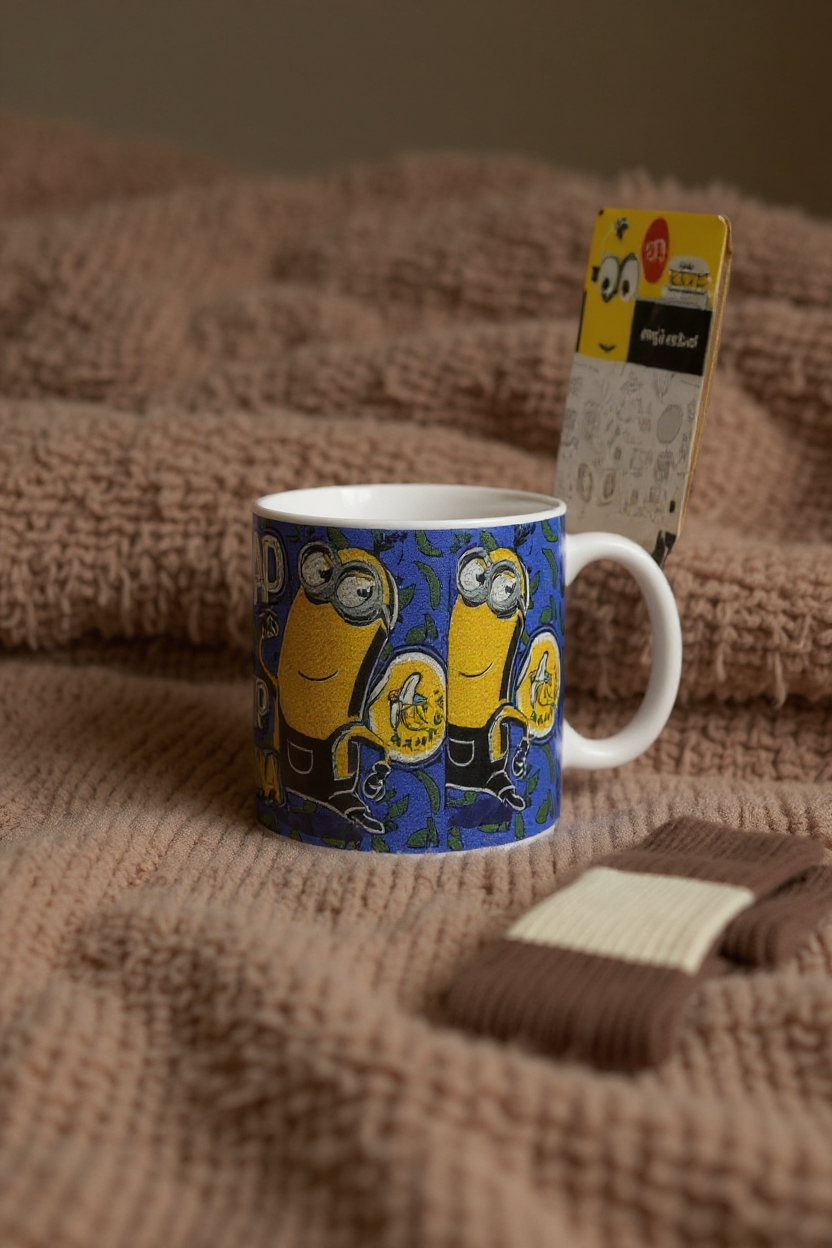 Mug designed with a sturdy, ergonomically shaped handle and a classic form, ideal for keeping beverages warm; socks offer a comfortable fit with a cushioned sole, perfect for lounging, adding a touch of personality with their Minion design that transforms every sip and step into a hilarious moment.