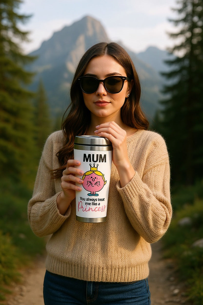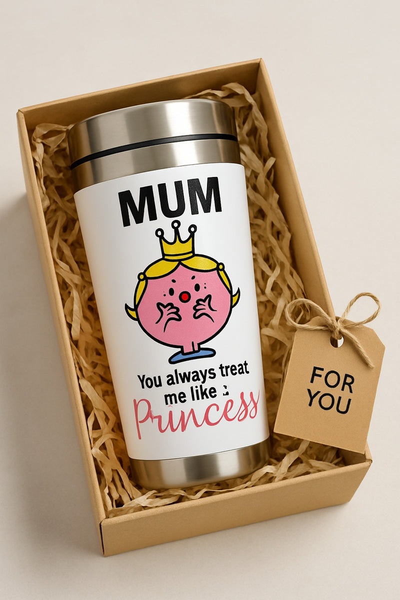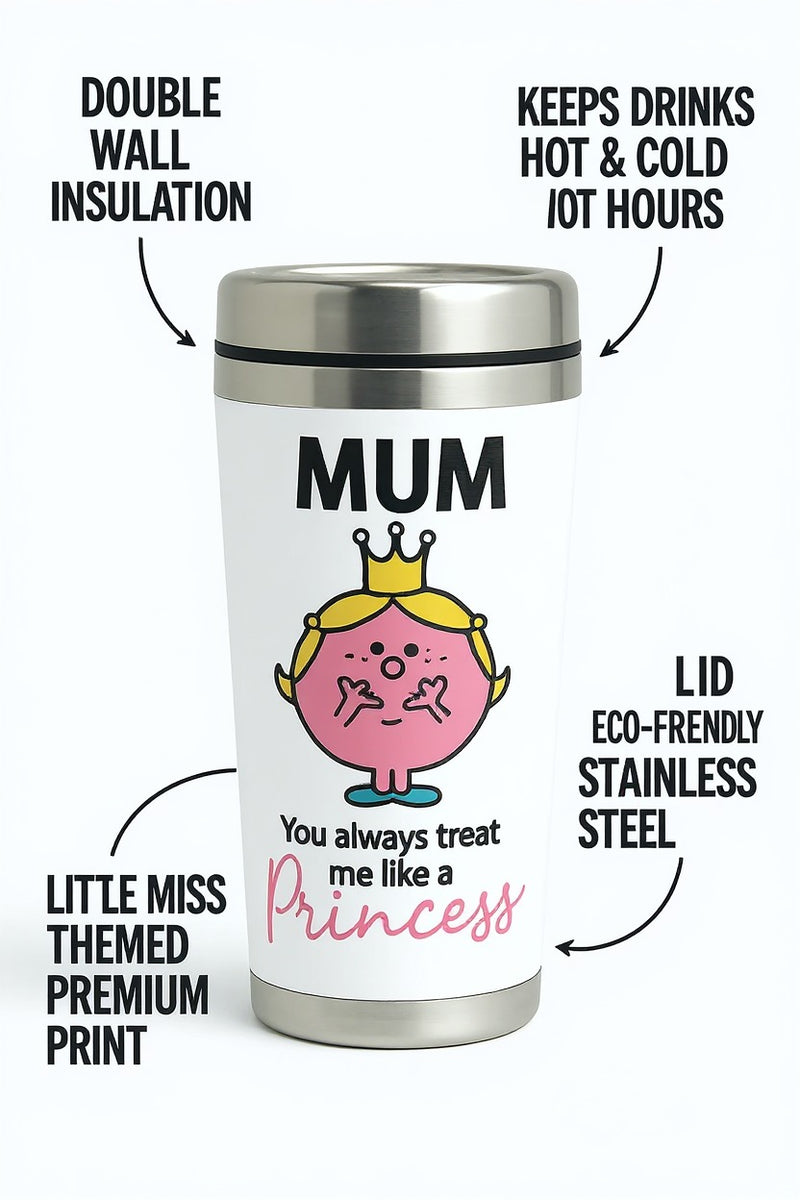 Displays a cute pink Little Miss character with a golden crown and the sweet message "Mum, You're My Favorite Princess," adding a loving touch.